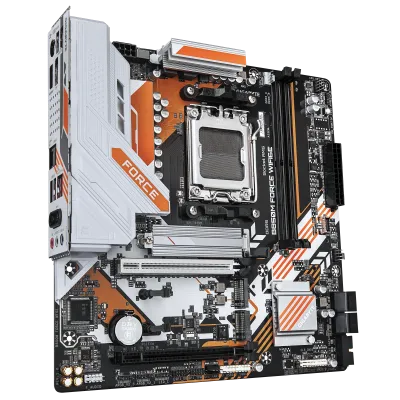 The GIGABYTE B850M FORCE WIFI6E AMD AM5 DDR5 Micro ATX Motherboard is a powerful and feature-rich motherboard designed to support the latest AMD Ryzen™ 8000 and 7000 series processors, delivering next-level performance, stability, and connectivity for gamers, content creators, and power users. Built on the AMD B850 chipset and featuring the AM5 socket, it provides cutting-edge support for DDR5 memory, ensuring faster speeds, higher bandwidth, and enhanced multitasking capabilities. Its Micro ATX form factor makes it a compact yet high-performance choice for building powerful small to mid-sized gaming or productivity rigs. Equipped with advanced PCIe 5.0 support, the B850M FORCE ensures ultra-fast data transfer rates for next-gen GPUs and NVMe SSDs, giving you the ultimate edge in speed and responsiveness. The motherboard also features Wi-Fi 6E and 2.5GbE LAN, offering lightning-fast and reliable wired and wireless networking, while USB 3.2 Gen 2x2 Type-C ports provide blazing-fast connectivity for modern peripherals. GIGABYTE’s exclusive features like Q-Flash Plus, Smart Fan 6, and advanced thermal design with extended heatsinks keep the system cool, efficient, and future-ready. With RGB Fusion support, customizable lighting zones, and durable Ultra Durable components, this motherboard combines reliability, performance, and aesthetics in one compact powerhouse. The GIGABYTE B850M FORCE WIFI6E is the perfect balance of innovation, connectivity, and efficiency, making it an excellent foundation for a high-performance AMD AM5 PC build.